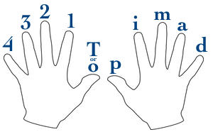 به انگشت آخر که تو تصویر d نامگذاری شده؛انگشت x هم میگن.می تونید نام این انگشتان رو با الگوی pimax (پیمکس) حفظ کنید.p انگشت شصت؛i اشاره؛m وسط و a هم حلقه هست.